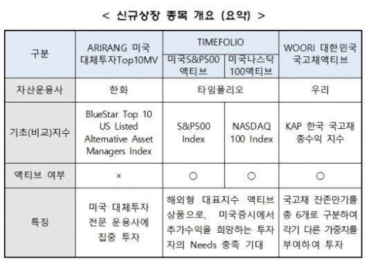 국고채 잔존만기를 총 6개로 구분해 각기 다른 가중치를 부여해 투자하는 ETF도 선보인다. 미국시장 대표지수 액티브 ETF도 나온다.
