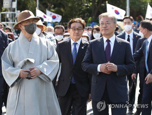 인사말을 마친 문 전 대통령은 사저 인근의 통도사 주지 스님과 김일권 양산시장 등과 400m가량을 걸어 사저로 향했다. 문 전 대통령의 낙향에 동행해 곁을 지킬 오종식 전 기획비서관도 함께했다.