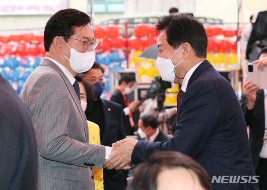 오세훈 서울시장(오른쪽)과 송영길 전 더불어민주당 대표이 지난 3월 30일 서울 종로구 조계사에서 대한불교조계종 제15대 종정 중봉 성파 대종사 추대법회에 참석해 인사를 나누고 있다./사진=뉴시스 |
