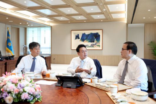 윤석열 대통령이 10일 서울 용산의 새 대통령실 집무실에서 김대기 비서실장(왼쪽), 김성한 국가안보실장(오른쪽) 등과 오찬 간담회를 하고 있다. 대통령실 제공 |