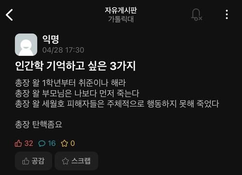 앞서 이번 논란은 지난달 28일 모 인터넷 대학생 커뮤니티 가톨릭대 전용 게시판에 '인간학 기억하고 싶은 3가지'라는 제목의 글이 게재되면서 불거졌다.
