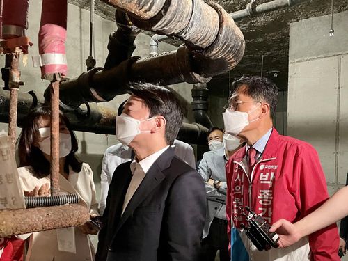 성남 분당의 한 아파트단지에서 노후시설을 둘러보는 국민의힘 안철수 후보 |