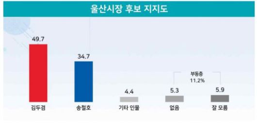 11일 리얼미터가 MBN 의뢰로 지난 9일부터 10일까지 울산에 사는 만 18세 이상 남녀 815명을 대상으로 조사한 결과, 김 후보 지지율은 49.7%인 것으로 나타났다. 송 후보는 34.7%였다. 두 후보의 지지율 격차는 15.0%포인트로, 오차범위(95% 신뢰수준 ±3.4%포인트) 밖이다.