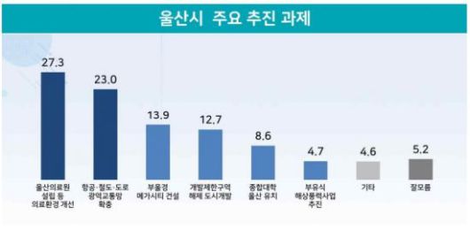 울산가 가장 역점을 두고 추진해야할 과제에 대해선 '울산의료원 설립 등 의료환경 개선'(27.3%)과 '항공, 철도, 도로 광역교통망 확충'(23.0%)을 꼽은 비율이 높았다. 이어 '부울경 메가시티 건설'(13.9%), '개발제한구역 해제 도시개발(12.7%)', '종합대학 울산 유치(8.6%)' 등이었다.