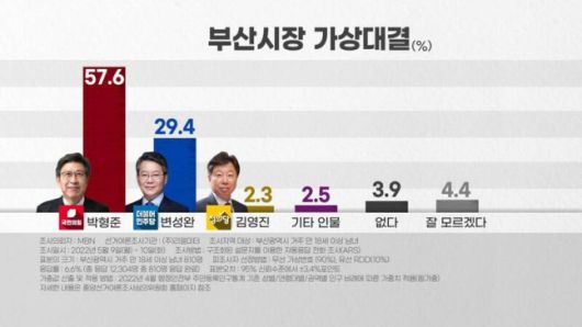 제 8회 6·1 전국동시지방선거가 20일 앞으로 다가온 가운데, 부산시장 가상대결에서 박형준 국민의힘 후보가 변성완 더불어민주당 후보를 오차범위 밖에서 앞선다는 여론조사 결과가 11일 나왔다.