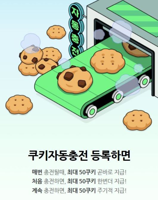 '쿠키자동충전' 기능을 이용하는 것도 방법이다. 매번 결제하는 불편을 줄이는 동시에 저렴한 비용으로 쿠키를 구매할 수 있다. 쿠키자동충전은 사용자가 설정한 조건에 따라 쿠키를 자동 충전하는 서비스다. 사용자는 보유한 쿠키가 특정 개수 이하이거나, 매월 원하는 날짜에 자동으로 충전하는 방식을 선택할 수 있다.