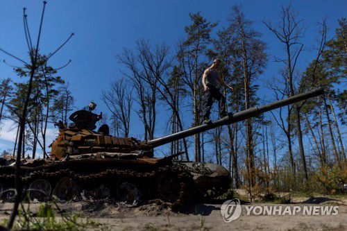 파괴된 러시아 탱크에 오른 우크라이나 주민들 |
