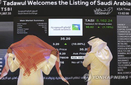 2019년 아람코 기업공개 이후 사우디아라비아 증시 전광판에서 뜬 아람코 주가 |