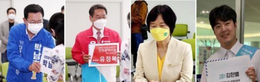 더불어민주당 박남춘 후보와 국민의힘 유정복 후보, 정의당 이정미 후보, 기본소득당 김한별 후보(왼쪽부터)|연합뉴스 제공 |