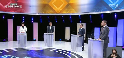 (수원=연합뉴스) 최찬흥 김솔 기자 = 6·1 지방선거에서 경기도지사에 출마한 국민의힘 김은혜, 더불어민주당 김동연, 정의당 황순식, 무소속 강용석 등 후보 4명은 12일 KBS 초청 토론회에서 핵심 공약을 놓고 날 선 공방을 벌였다.