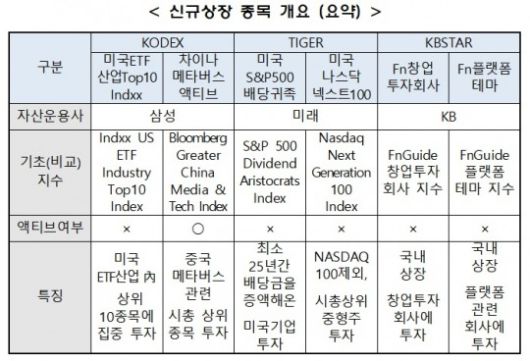 한국거래소(이사장 손병두)는 삼성자산운용의 'KODEX 미국ETF산업Top10 Indxx', 'KODEX 차이나메타버스액티브', 미래에셋자산운용의 'TIGER 미국S&P500배당귀족', 'TIGER 미국나스닥넥스트100', KB자산운용의 KBSTAR Fn창업투자회사' 등 ETF 6종목(테마형 5, 액티브1)을 오는 5월 17일 유가증권시장에 상장할 예정이라고 13일 밝혔다.