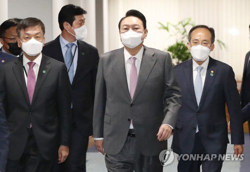 거시금융상황점검회의 참석하는 윤석열 대통령(서울=연합뉴스) 서명곤 기자 = 윤석열 대통령이 첫 대외 현장 행보로 13일 오전 서울 중구 명동 국제금융센터에서 열린 거시금융상황 점검회의에 참석하고 있다. 왼쪽은 최상목 경제수석, 오른쪽은 추경호 경제부총리 겸 기획재정부 장관. 2022.5.13 seephoto@yna.co.kr ▶제보는 카카오톡 okjebo▶연합뉴스 앱 지금 바로 다운받기~▶네이버 연합뉴스 채널 구독하기<저작권자(c) 연합뉴스, 무단 전재-재배포 금지>