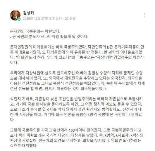 김 비서관은 2020년 12월에 밴드에 쓴 글에서도 문 전 대통령을 ‘김일성’에 빗대는 색깔론을 펼쳤다. 그는 코로나19 방역 정책과 관련한 글에서 “문재인의 ‘국뽕 주의’는 김일성주의의 아류작”이라며 “우리를 지상낙원에 살도록 인도해주신 어버이 김일성 수령의 자리를 문재인 수령으로 대체하려 한다. 외국에서 대한민국을 추앙한다는 선동도 북한식 선전을 빼닮았다”고 밝혔다 . 이에 더해 “식민지 지배로 자존감 낮은 조선인을 반일주의라는 배타적 자존심으로 무장시키고 국뽕 한 사발을 들이키게 하면 어떤 정치적 과오도 묻을 수 있었다”고 적었다.