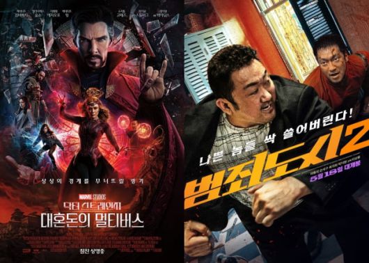 마블 영화 '닥터 스트레인지: 대혼돈의 멀티버스'가 450만 돌파를 향하고 있다. 마동석 주연 한국영화 '범죄도시2'가 '닥터 스트레인지2'의 독주를 막아설 채비를 하고 있다.