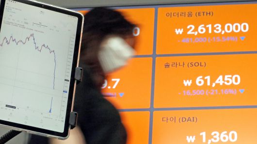12일 서울 서초구 빗썸 고객센터 전광판에 비트코인 등 각종 가상자산의 가격이 표시되고 있다. 최근 한국 블록체인 기업 테라가 발행하는 스테이블코인 '테라'가 무너지면서 자매코인격인 '루나' 역시 5월초 대비 99% 폭락했다. /뉴스1 |