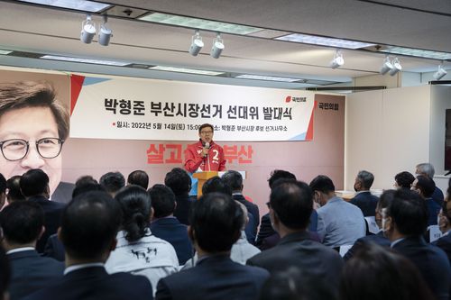 (부산=연합뉴스) 민영규 기자 = 재선에 도전하는 국민의힘 박형준 부산시장 후보의 선거대책위원회는 14일 부산 부산진구 서면에 있는 박 후보 선거사무소에서 발대식을 하고 본격 활동에 들어갔다.