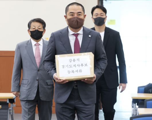 강용석 무소속 경기도지사 후보가 12일 오전 경기도 수원시 경기도선거관리위원회에서 제8회 전국동시지방선거 후보자 등록을 하고 있다. [사진 = 연합뉴스] |