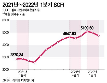 지난해의 경우 SCFI 2000선 수준에서 체결됐지만 올해는 SCFI 평균이 급등하면서 장기계약 가격도 크게 올랐다. 지난해 4분기보다 비용이 급등했음에도 새로 체결된 장기계약 중 일부가 올해 1분기 실적에 반영되면서 이를 상쇄했다는 설명이다.