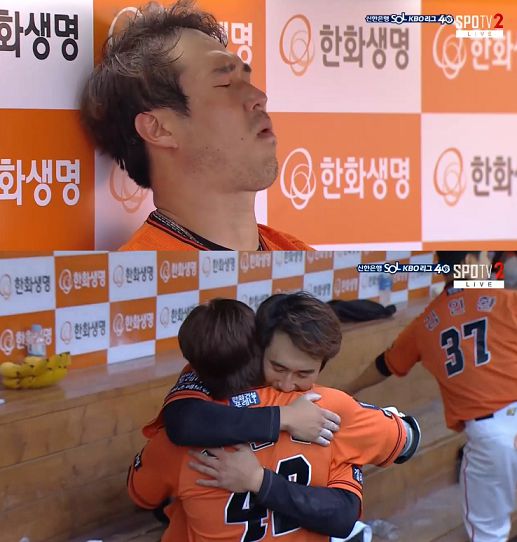 덕아웃에서 뒷머리를 찧으며 자책하던 장민재가 역전 그랜드슬램을 터트린 정은원을 끌어안고 감격하는 장면. / SPOTV 중계화면 |