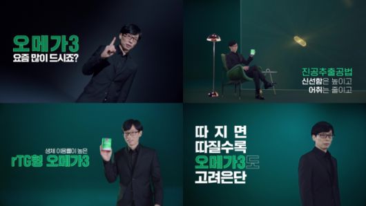 광고에서 유재석은 “‘퓨어 알티지 DHA 오메가3’가 특허 받은 진공추출공법을 통해 신선함을 높이고 어취를 줄였다”고 소개하며 “특히 오메가3 900mg(EPA 150mg, DHA 750mg)으로 혈행 건강과 기억력 개선까지 한 번에 챙길 수 있다”고 강조한다.
