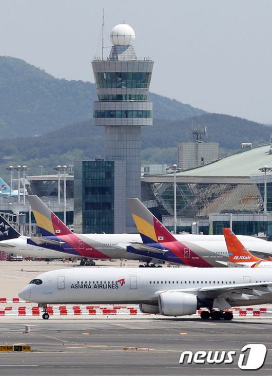 (인천공항=뉴스1) 민경석 기자 = 아시아나항공 및 저비용항공사(LCC)의 올해 1분기 실적 발표가 예정된 16일 인천국제공항 제2여객터미널 계류장에 아시아나항공 여객기가 이륙을 준비하고 있다. 2022.5.16/뉴스1