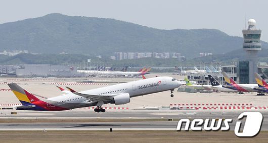 (인천공항=뉴스1) 민경석 기자 = 아시아나항공 및 저비용항공사(LCC)의 올해 1분기 실적 발표가 예정된 16일 인천국제공항 제2여객터미널 계류장에 아시아나항공 여객기가 이륙하고 있다. 2022.5.16/뉴스1