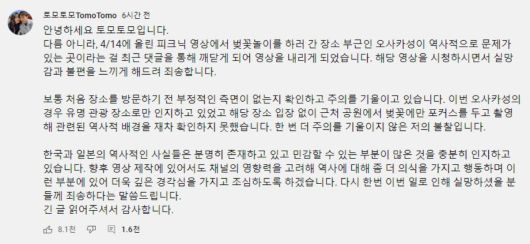 오늘(16일) '토모토모' 유튜브 채널 커뮤니티에는 "지난 4월 14일에 업로드한 피크닉 영상에서 벚꽃놀이를 위해 방문했던 곳 인근에 있는 오사카성이 역사적으로 문제가 있다는 것을 최근 댓글을 통해 알게 돼 영상을 내렸다"는 사과문이 공개됐습니다.