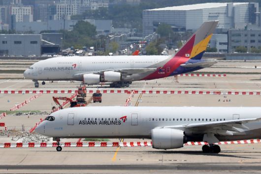 (인천공항=뉴스1) 민경석 기자 = 아시아나항공 및 저비용항공사(LCC)의 올해 1분기 실적 발표가 예정된 16일 인천국제공항 제2여객터미널 계류장에 아시아나항공 여객기가 이륙을 준비하고 있다. 2022.5.16/뉴스1 |