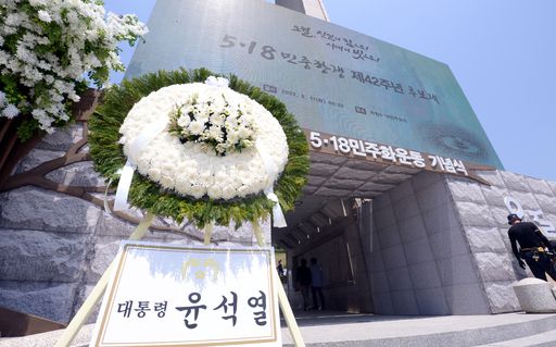 5·18 민주화운동으로 희생된 영령들을 추모하는 제42주년 추모제가 열린 17일 광주 북구 국립 5·18민주묘지에 윤석열 대통령이 보낸 조화가 놓여 있다. 광주=뉴스1 |