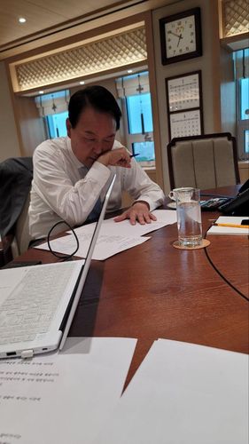 용산 대통령실 청사 집무실에서 5·18 기념사를 퇴고 중인 윤석열 대통령 [대통령실 관계자 제공] |