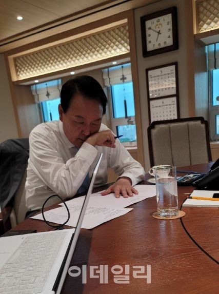 윤석열 대통령이 기념사를 수정하고 있다.(사진=대통령실 관계자) |