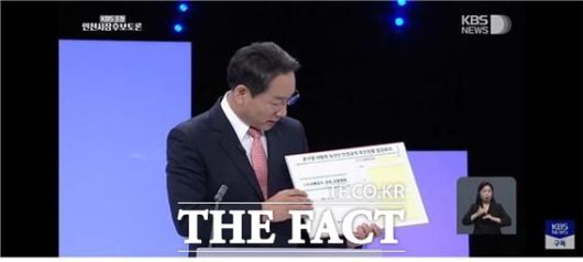 유정복 국민의힘 인천시장 후보가 KBS 방송토론회에서 수도권 쓰레기 대체 매립지에 대해 설명하고 있다. 사진/더팩트DB |