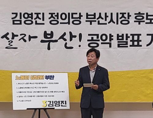 (부산=연합뉴스) 오수희 기자 = 정의당 김영진 부산시장 후보는 18일 "부산을 노동이 당당한 도시로 만들겠다"며 노동 분야 공약 5개를 발표했다.