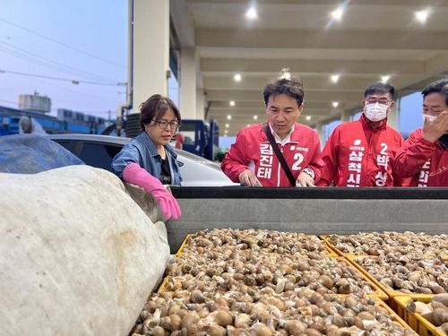김진태 후보는 이날 오전 4시 30분 박상수 삼척시장 후보 등과 삼척 정라항 어판장을 찾아 경매하러 나온 어민들을 만났다.