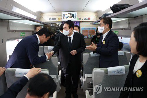 광주행 특별열차에서 여당 의원들과 인사하는 윤석열 대통령 |