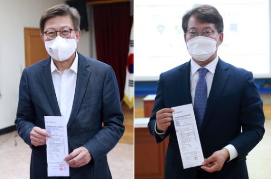 부산시장에 출마하는 국민의힘 박형준 후보(왼쪽)와 더불어민주당 변성완 후보가 지난 12일 부산 연제구 부산시선관위에서 후보 등록을 하고 있다. 연합뉴스 |