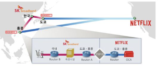넷플릭스는 위 그림을 보여주며 ‘넷플릭스는 오픈커넥트(OCA)를 통해 송신 ISP를 거치지 않고 SK브로드밴드의 네트워크와 ‘피어링’ 방식으로 직접 연결하고 있다“고 밝혔다. 그림: 넷플릭스 제공 |