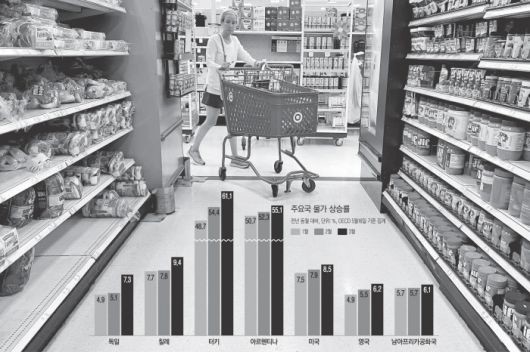 유럽도 사정이 다르지 않다. 지난 4월 독일의 CPI 상승률은 40년 만의 최고치인 7.4%였다. 우크라이나 사태로 원자재, 에너지가격이 오른 게 물가를 자극하고 있다. 베를린에 사는 유학생 정수민씨(29)는 “마트에 가면 매장 선반에 식용유, 밀가루가 없다. 카운터에 가서 ‘식용유 있냐’고 물어봐야 하고, 1인당 1개밖에 살 수 없다”며 “예전에는 이런 경우를 보지 못했다”고 말했다.