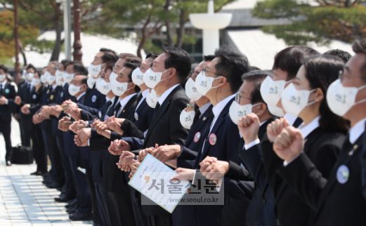 윤석열 대통령이 18일 광주 북구 국립5?18민주묘지에서 열린 제42주년 5.18민주화운동 기념식에서 ‘임을 위한 행진곡’을 제창하고 있다. 2022. 5. 18 박지환 기자 |