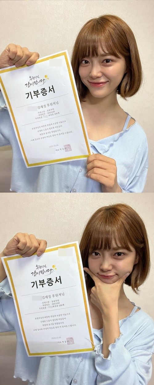 이번에 공개된 사진에는 기부 증서를 들고 셀카를 남기고 있는 김세정의 모습이 담겨 있다.