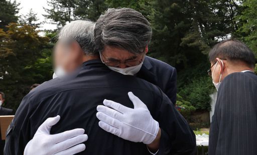 19일 서울 동작구 국립서울현충원 경찰충혼탑 앞에서 열린 5·18민주화운동 당시 순직한 전남 함평경찰서 경찰관 유가족과 사건 당사자의 사과·화해 행사에서 경찰관 4명을 숨지게 한 배모씨와 유가족 정원영(오른쪽)씨가 서로를 끌어안고 있다. 5·18민주화운동 진상규명조사위원회에 따르면 배씨는 1980년 5월20일 밤 시위대의 전남도청 진입을 차단하기 위해 진압대형을 갖추고 서 있던 경찰관들을 향해 버스를 운전해 돌진했다.