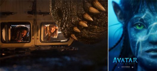 다음 달 1일 개봉하는 ‘쥬라기 월드: 도미니언’의 한 장면(왼쪽 사진)과 올해 12월 개봉하는 ‘아바타: 물의 길’ 포스터. 유니버설픽처스·월트디즈니컴퍼니코리아 제공 |