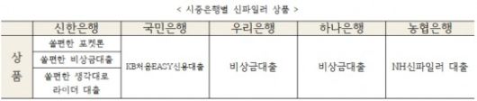 신한은행은 현재 '쏠편한 포켓론', '쏠편한 비상금 대출', '쏠편한 생각대로 라이더 대출' 등을 운용하고 있다. 국민은행은 새로운 소득산정방식과 신용평가방식을 적용해 'KB처음EASY신용대출' 상품을 취급 중이다. 하나·우리은행도 최대 300만원 1년 대출기간 한도로 비상금대출을 제공하고 있다.