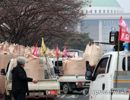 지난 2월 서울 여의도에서 농민들이 쌀값 보장을 촉구하는 집회를 하고 있다. |