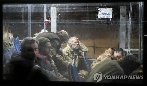 버스로 호송되는 우크라이나 아조우스탈 투항병들 |
