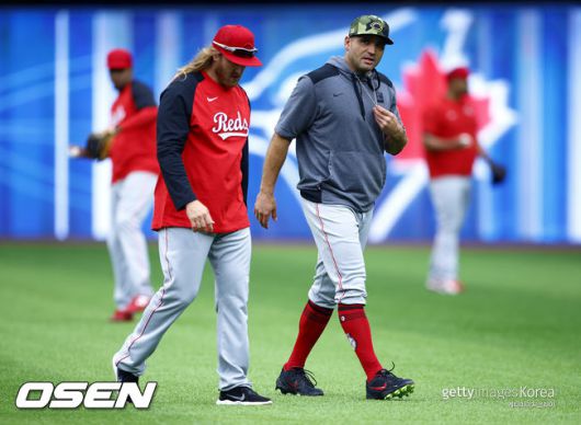[OSEN=길준영 기자] 토론토 블루제이스 류현진(35)이 키움 히어로즈에서 뛰었던 신시내티 레즈 테일러 모터(33)를 만났다.