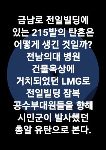 신 전 특보는 전날 페이스북에 "금남로 전일빌딩에 있는 215발의 탄흔은 어떻게 생긴 것일까? 전남의대 병원 건물옥상에 거치되었던 LMG(경기관총:Light Machine Gun)로 전일빌딩 잠복 공수부대원들을 향해 시민군이 발사했던 총알 유탄으로 본다"는 글을 올렸다.