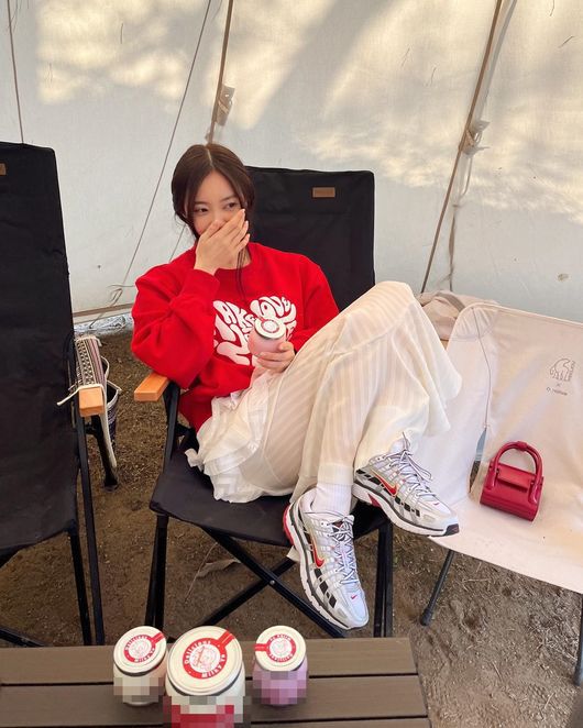 사진에서 효민은 캠핑 중으로, 의자에 앉아 다리를 올리고 쉬고 있다. 시스루 치마로 다리 라인을 은근히 드러내 섹시한 매력을 보였다.