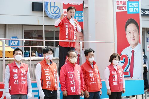 (청주=연합뉴스) 박재천 기자 = 공식 선거운동이 시작된 이후 첫 일요일인 22일 여야 충북지사 후보들은 분주히 표밭을 갈았다.
