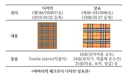 버버리는 한국에 스카프, 신발, 모자, 셔츠, 슬리퍼, 직물지에 대하여 총 6개의 체크무늬 디자인권을 보유하고 있었으며, 표의 제099837호가 직물지에 등록된 디자인권이다. 또한, 버버리는 체크무늬에 대하여 총 11개의 상표권을 보유하고 있었으며, 표의 제0419956호가 의류 등에 등록된 상표권이다.